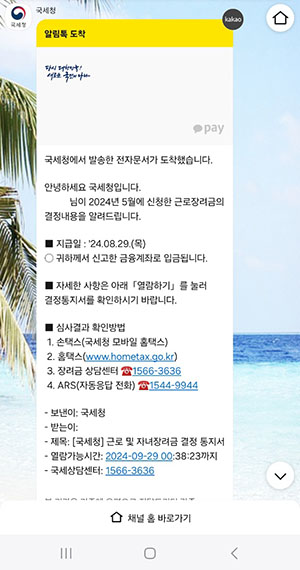 근로장려금을 신청하고 지급이 결정되면 아래처럼 결정내용이 카톡 알림톡으로 옵니다. 그리고 신청할때 기재한 계좌로 바로 입금이 되는 걸 확인 할 수 있었습니다. 아래는 제가 국세청에서 받은 결정내용 알림톡입니다.